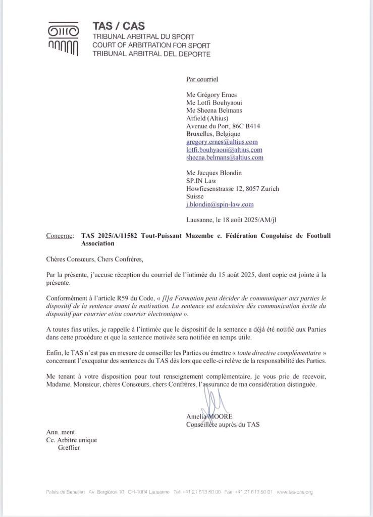 Dans un courrier adressé aux avocats des deux parties, le Tribunal Arbitral du Sport (TAS) a confirmé avoir reçu les observations de la FECOFA, datées du 15 août. L’instance arbitrale a rappelé que, conformément à l’article R59 de son Code, le dispositif de la sentence – c’est-à-dire la décision rendue – avait déjà été communiqué et qu’il était exécutoire immédiatement, même si la motivation détaillée n’a pas encore été transmise.
