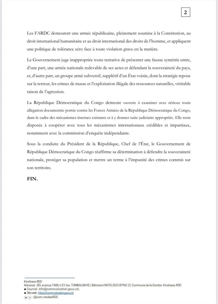 Le gouvernement souligne que les crimes documentés – incluant des massacres, des déplacements forcés et des violences sexuelles – ne sauraient rester impunis. À cet effet, il appelle à une mobilisation internationale accrue afin de traduire les responsables devant la justice et de mettre fin à l’impunité dont bénéficient certains acteurs régionaux.