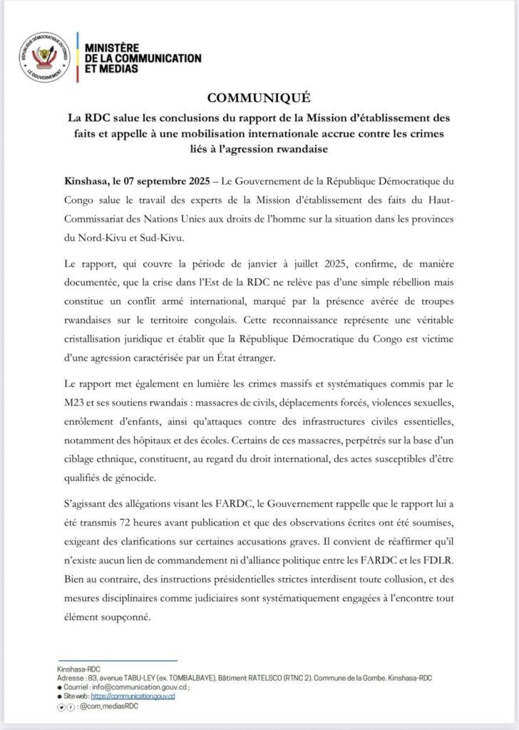 Le Gouvernement de la République Démocratique du Congo a réagi officiellement aux conclusions de la Mission d’établissement des faits, qui a documenté de graves violations des droits humains et des crimes liés à l’agression rwandaise dans l’Est du pays.