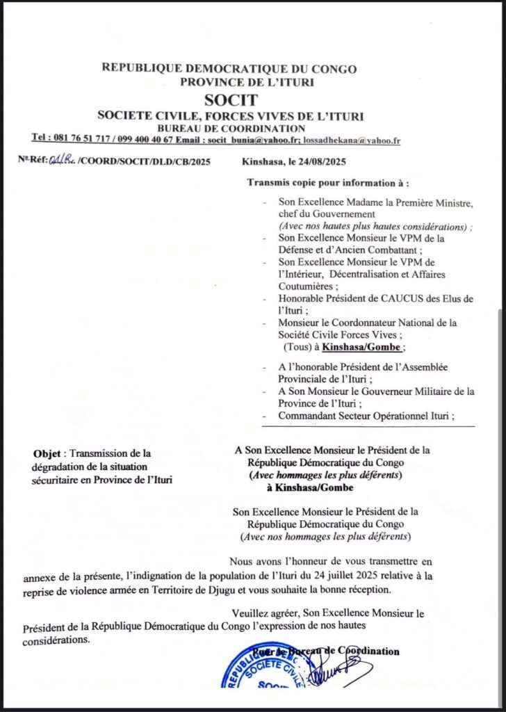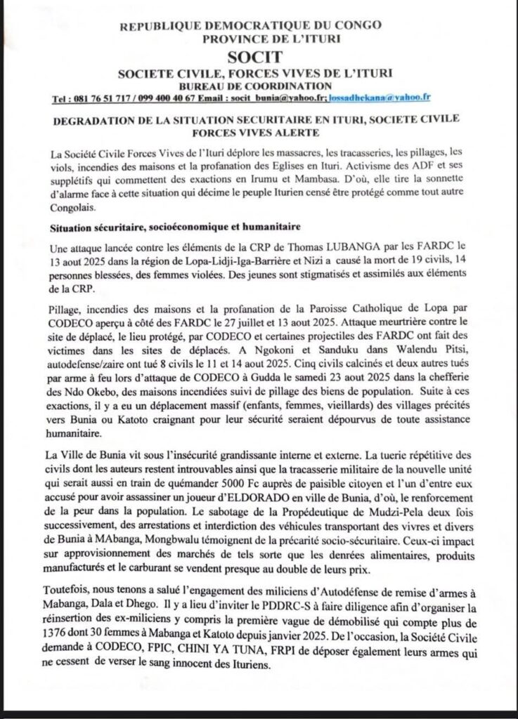 La société civile appelle le gouvernement congolais et ses partenaires internationaux à agir urgemment afin de mettre un terme aux massacres, protéger les civils et restaurer une paix durable en Ituri.