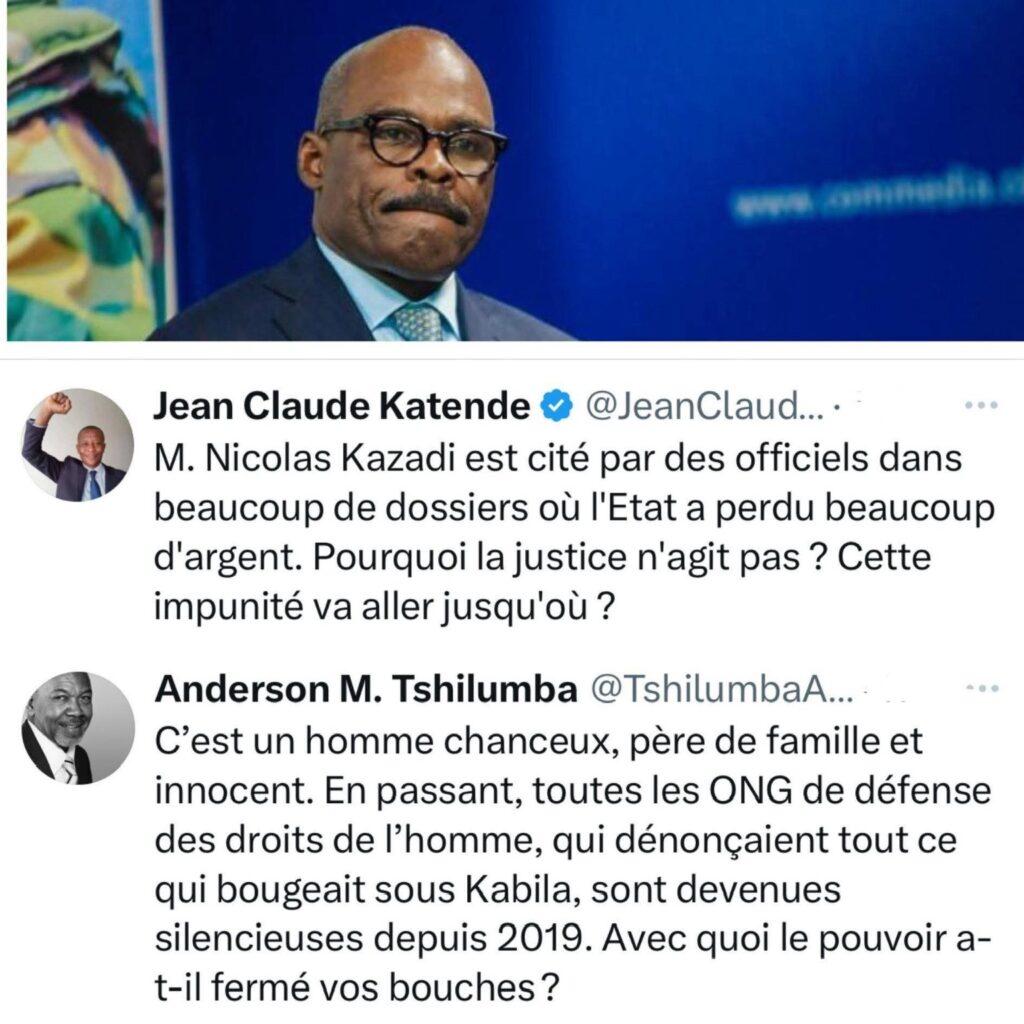L’échange entre Katende et Tshilumba intervient dans un contexte marqué par une méfiance croissante de l’opinion publique envers la justice congolaise, accusée de deux poids, deux mesures. D’un côté, des poursuites judiciaires rapides et spectaculaires ont visé plusieurs figures de l’ancien régime de Joseph Kabila. De l’autre, des responsables proches de l’actuel pouvoir, dont Nicolas Kazadi, sont accusés de bénéficier d’une certaine protection politique malgré les soupçons qui pèsent sur eux.