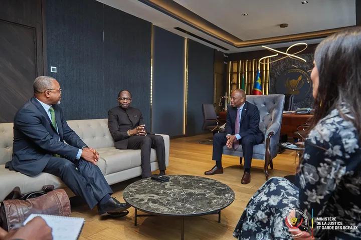 Le Ministre d’État, Ministre de la Justice et Garde des Sceaux, Guillaume NGEFA ATONDOKO ANDALI, a reçu en audience le Professeur Taylor Lubangu, Chargé de mission du Président de la République près la Cour pénale internationale (CPI), accompagné de deux représentants du Bureau du Procureur.