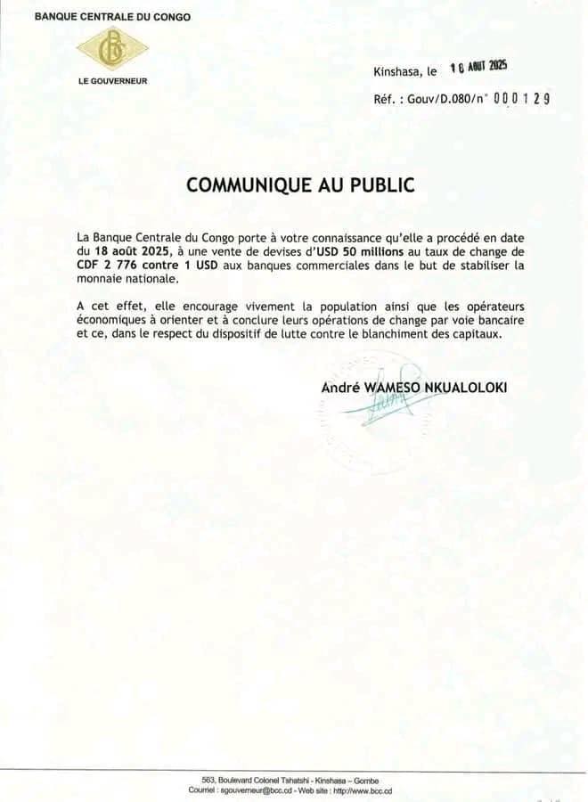 La Banque Centrale du Congo (BCC) a annoncé, à travers un communiqué officiel signé par son gouverneur André Wameso Nkuatoloki, la vente de 50 millions de dollars américains aux banques commerciales. Cette opération interviendra le 18 août 2025, au taux de 2 776 CDF pour 1 USD, avec pour objectif principal de stabiliser la monnaie nationale et de renforcer la confiance sur le marché de change.