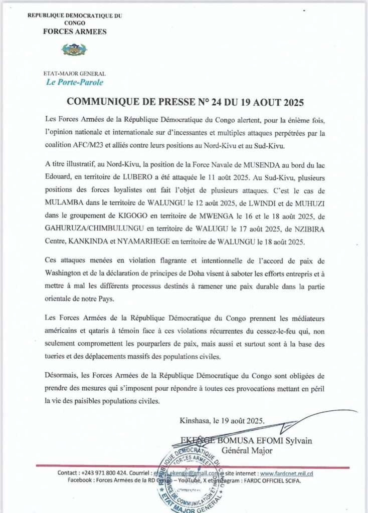 Les Forces Armées de la République Démocratique du Congo (FARDC) ont une nouvelle fois alerté, ce 19 août 2025, sur la multiplication des attaques menées par la coalition M23/AFC et leurs alliés contre les positions loyalistes dans les provinces du Nord-Kivu et du Sud-Kivu.