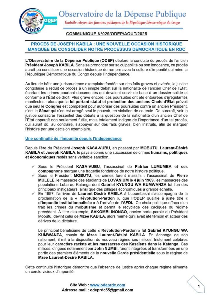 L’Observatoire de la Dépense Publique (ODEP) a réagi, dans un communiqué parvenu à notre rédaction, à la conduite du procès de l’ancien président Joseph Kabila. Selon l’organisation, cette procédure représentait une occasion historique de rompre avec la culture de l’impunité qui mine la République Démocratique du Congo depuis son indépendance.