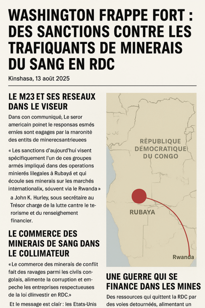 Kinshasa, 13 août 2025 – Les États-Unis viennent de serrer l’étau autour des acteurs qui saignent l’Est de la République démocratique du Congo. Mardi, le Bureau du contrôle des avoirs étrangers (OFAC) du Département du Trésor américain a annoncé des sanctions visant des entités accusées de nourrir la violence et de piller les ressources minières du pays.
